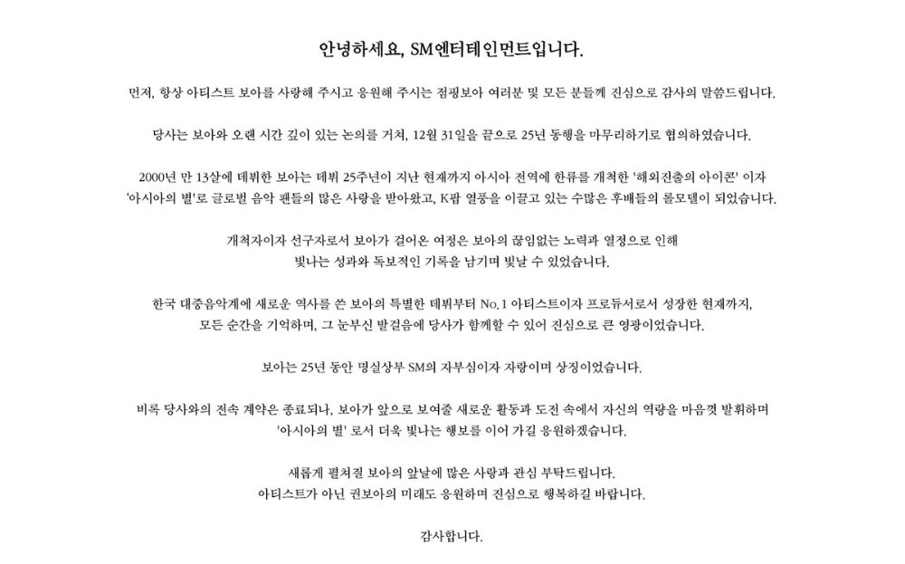 The statement continues with a brief highlight of BoA’s career, adding, “For 25 years, BoA has been, without question, the pride, joy, and symbol of SM.” The post continues, “Although our exclusive contract is coming to an end, we will continue to support BoA as she fully demonstrates her capabilities in the new activities and challenges ahead, and we hope she will shine even brighter as the ‘Star of Asia’.”
