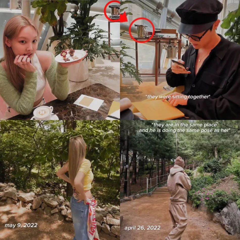 The first photo allegedly shows the two stars sitting at the same table in a café, with the background appearing identical. The second photo shows the public figures at the same spot in a park, striking similar poses. The following set of photos in the TikTok post presented more so-called evidence of their relationship, with the idols either wearing the same brand of clothing or accessories, being at the same location, or ordering the same food.