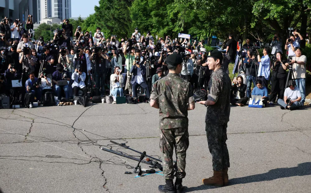 Park Jimin, 30, and Jeon Jungkook, 28, greeted the waiting journalists and ARMYs at the front of the base camp in Yeoncheon, Gyeonggi, at around 9am KST. The crowd cheered for the two as they made their first public appearances since their enlistment. The duo thanked the crowd for patiently waiting for them, with Jimin saying to fans, “Thank you so much for coming all this way to see us, ARMYs”.