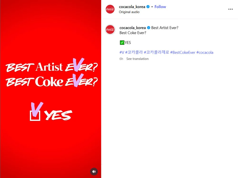 In an interview with Eyes Magazine, the 30-year-old shared his thoughts about the collaboration, “I am feeling the absolute best about working with Coca-Cola. I hope everyone can enjoy Coca-Cola Zero and show love and support for the brand!”. With this new collaboration, V takes over the ambassador role from girl group NJZ (formerly NewJeans), who promoted the brand in 2023.