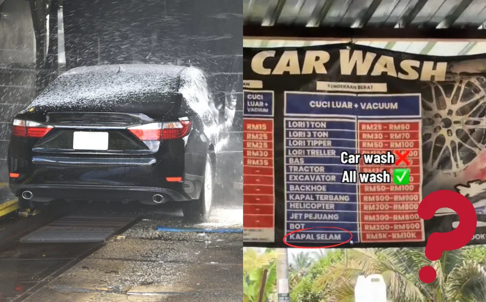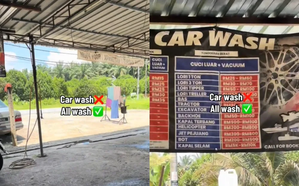 With the caption, “Car Wash X, All Wash✔”, the video shows the establishment’s banner that conspicuously shows the pricing for an exterior wash and interior vacuum service for all vehicle types. Ranging from as low as RM25 to wash a 1-ton lorry, the inclusion of washing fighter jets and submarines can go up to a whopping RM10K price tag. We aren’t certain if the car wash accepts these vehicles, or if this is just a really good marketing strategy.