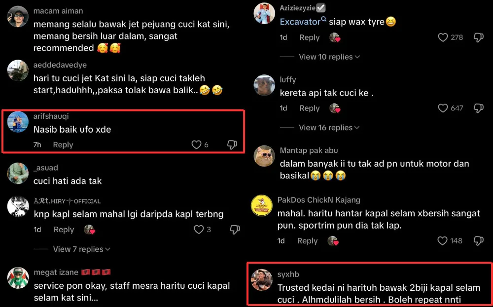 Nevertheless, netizens were quick to quip on their hilarious reviews of the service. User @/syxhb comments, “Trusted establishment, I brought my two submarines here for a wash. Alhamdulillah, it’s clean. Will repeat soon”. More netizens came forward to comment on ASM’s extensive services, noting that it technically doesn’t encompass all vehicles, like how user @/arifshauqi puts it, “Luckily they don’t wash UFOs”.