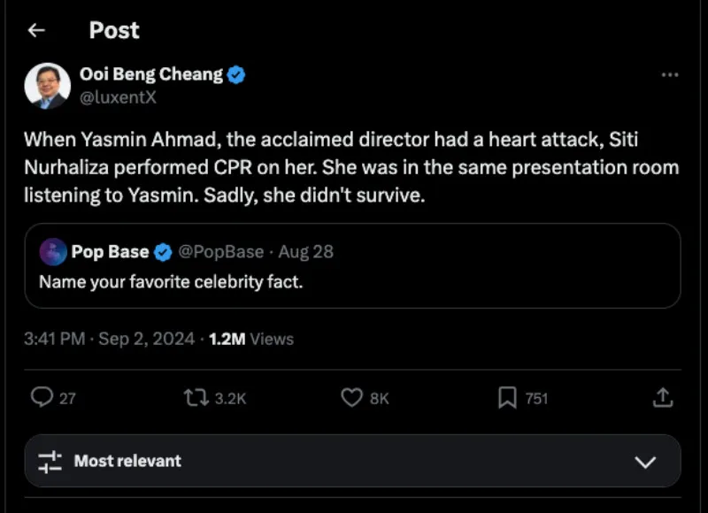 Recently, there’s been a trend on Twitter where netizens share their favourite celebrity facts. One former broadcaster joined in on the conversation and brought up the time Siti Nurhaliza tried to save Yasmin Ahmad’s life by performing CPR on her. The singer and her husband Datuk Khalid were in the same presentation room with the filmmaker when the incident happened.