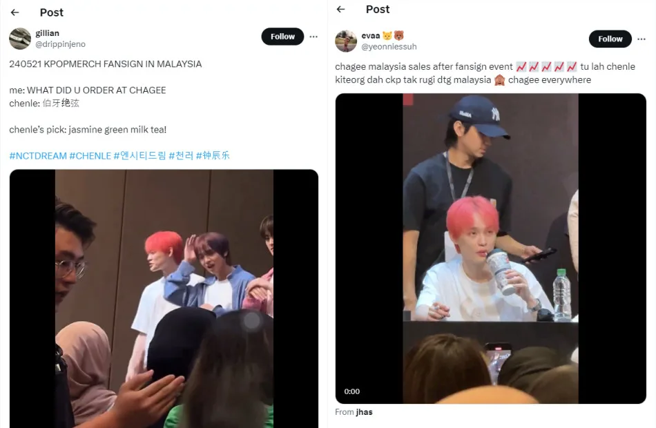 CHAGEE Malaysia’s official Twitter account reposted the video, adding the caption, “Chenle has taste.” Praising the 22-year-old singer for his excellent choice, CHAGEE further engaged fans by asking, “Comment who should be our next brand ambassador!” This post quickly gained traction, with NCT Dream fans enthusiastically suggesting Chenle as the next brand ambassador.