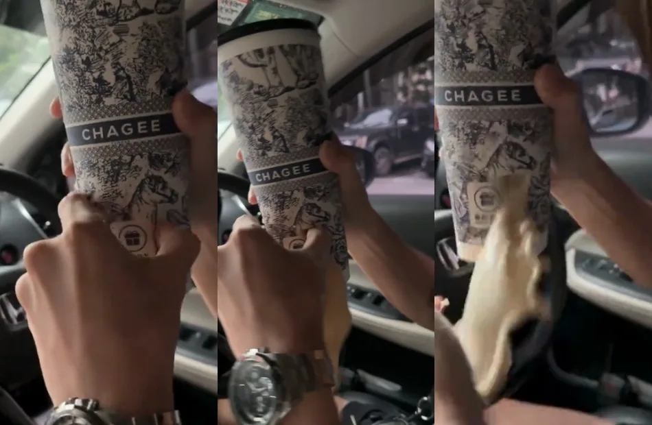 A woman, known as Tiffany, posted a video on Xiaohongshu of her and her partner’s experience with the CHAGEE ‘Tear & Win’ contest. As seen in the screenshots above, the man, identified as Yap Jun Hao, enthusiastically peeled off the bottom of his cup when, suddenly, his drink started spilling out, causing a huge mess in the car. The video has since gone viral with netizens being both amused and confused over the incident.
