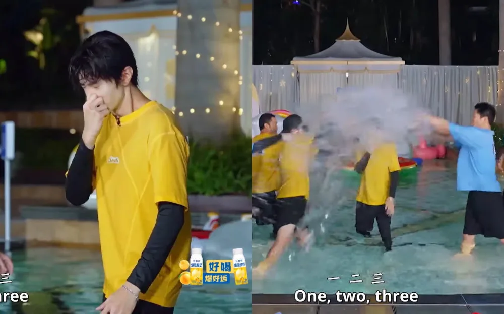 However, Chen Zheyuan insisted on keeping his wig on, joking that he wanted to test the quality. As soon as the water hit the actor, his wig instantly flew away, exposing his buzz cut. The cast immediately burst into laughter at the scene. Funnily, some guests even hurried to pick the wig from the pool and placed it back on Chen Zheyuan’s head. They even jokingly shouted at the cameras, telling them to stop recording.