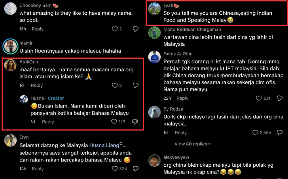 Malaysian netizens have shown clear excitement over the video, with one TikTok user (@/syafi_kahirul) commenting, “So you tell me you are Chinese, eating Indian food and speaking Malay”. Some were also questioning the reason behind the Malay names, to which Husna replies, “We are not Muslims. The names were given to us by our lecturer when we were studying Bahasa Melayu”.