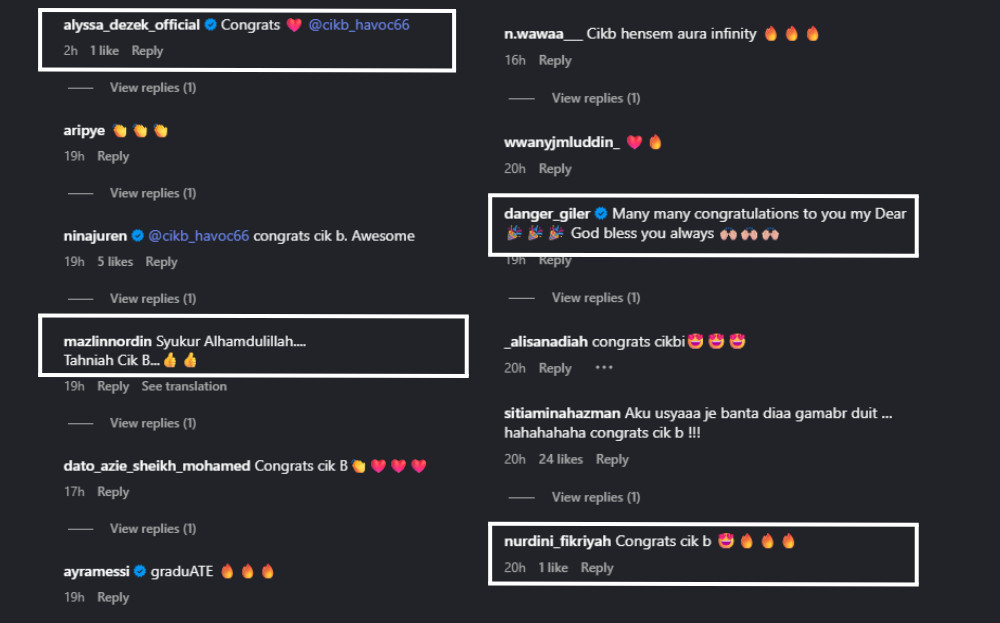 As expected, her posts quickly drew waves of attention from fans and followers alike, with many flooding the comments section to shower her with praise and heartfelt congratulations. We join her supporters in wishing Cik B continued success and the very best in her future endeavours, both academically and personally.