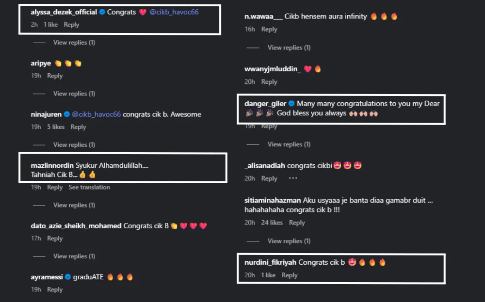 As expected, her posts quickly drew waves of attention from fans and followers alike, with many flooding the comments section to shower her with praise and heartfelt congratulations. We join her supporters in wishing Cik B continued success and the very best in her future endeavours, both academically and personally.