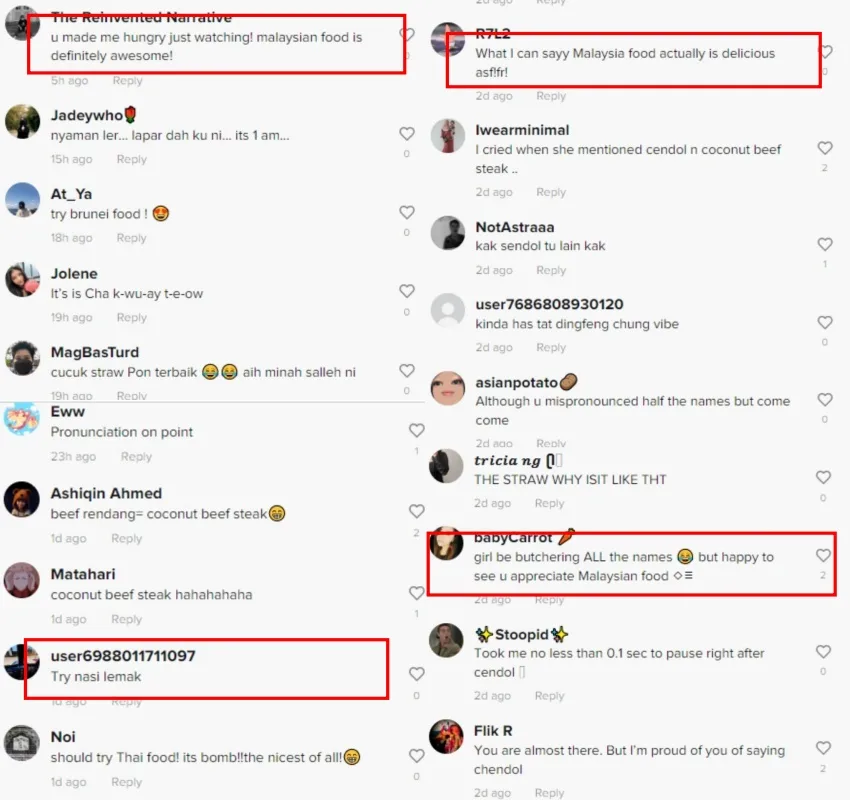 After trying all the Malaysian food she ordered, Maria gave a 9/10 rating saying, “There wasn’t a single thing in there I didn’t love.” Although she mispronounced some of the dishes, Malaysian netizens still enjoyed her video and were glad that she appreciates the food. Some left more food recommendations for the TikToker to try in the future.