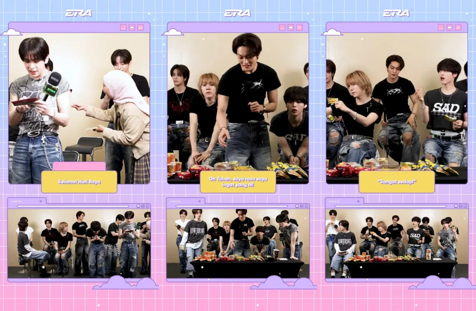 Since Hari Raya had come up in conversation, and with Aidiladha, or Hari Raya Haji, being celebrated at the time of the interview, Muna took the opportunity to gift each member an envelope containing duit raya. “Selamat Hari Raya!” she said cheerfully as she handed them out. Another highlight of the interview was when the host introduced the group to a variety of nostalgic Malaysian childhood snacks, including Tiger Biscuits, Apollo, Mamee Monster, and Nyam Nyam. Taeyoung, who lived in Malaysia when he was younger, recognised one of the foods on the table.