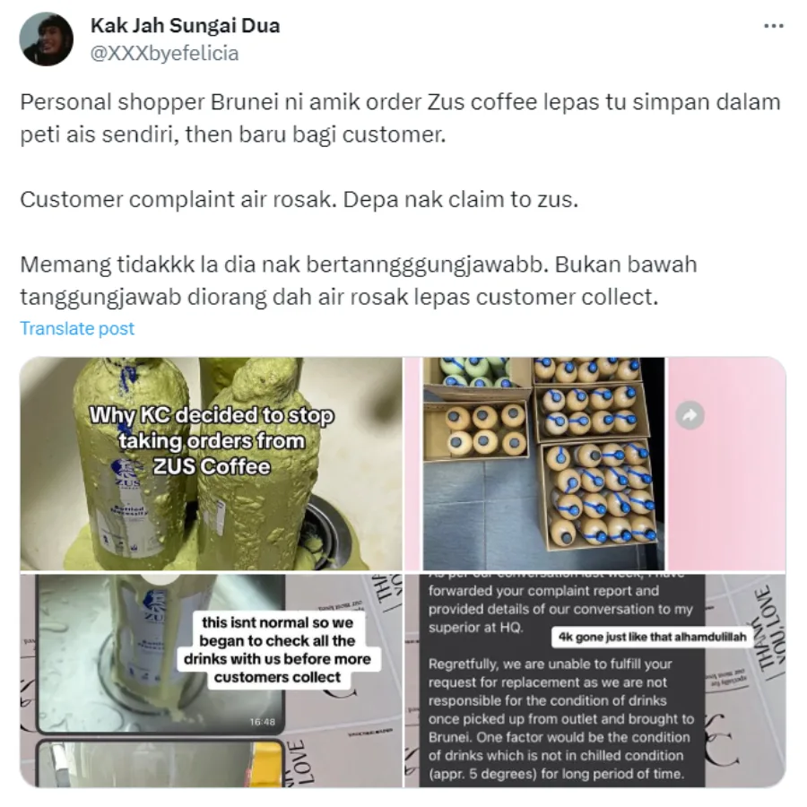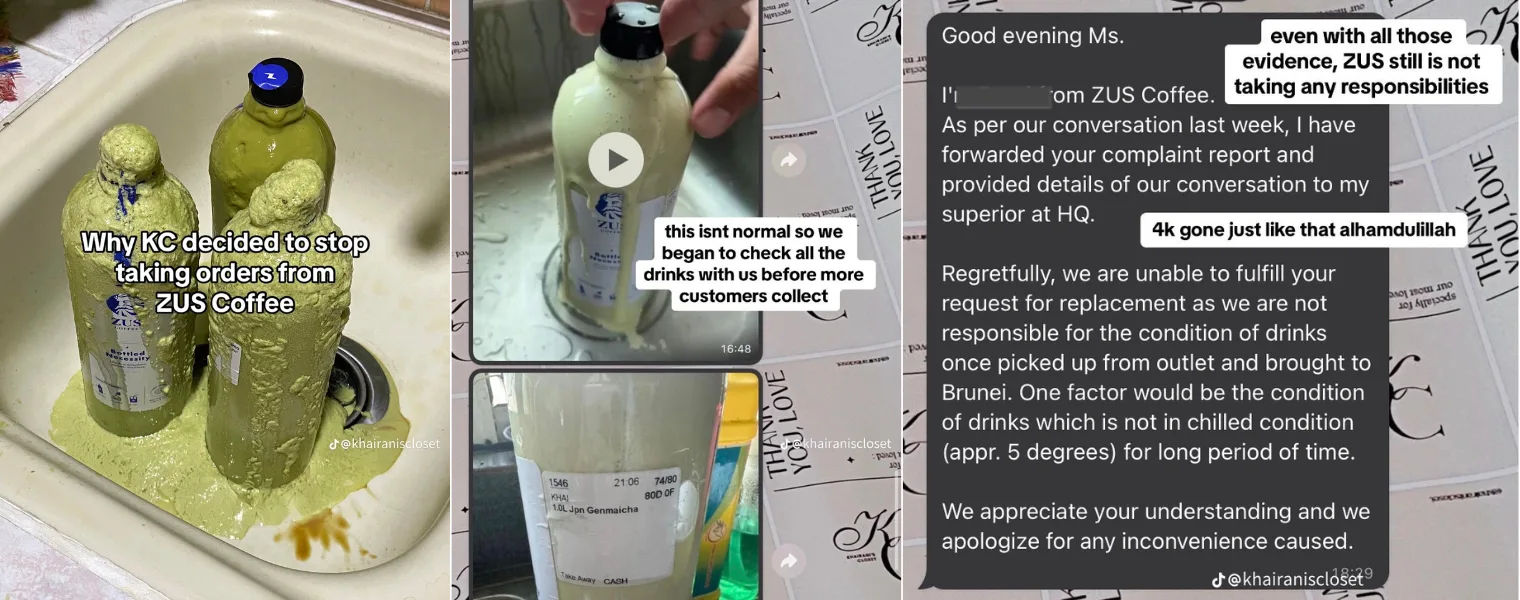 The post was first posted on TikTok in early January but went viral recently after a netizen posted it on Twitter. The Brunei-based personal shopper service, Khairani’s Closet, posted a video to detail why she will no longer accept orders for ZUS Coffee products. In the post, the shopper shared that her orders for the brand’s 1-litre Bottle Necessity drinks were spoiled after transporting it from Sabah back to Brunei, causing a total loss of over 4,000 Brunei dollars.