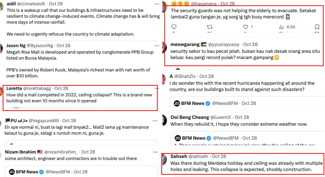 A customer posted a video of the ceiling collapsing in real time on Facebook that has since gone viral. In her original post, the incident occurred at around 2:57pm. Others have also posted the same incident from different perspectives. One video showed customers who were dining at a restaurant inside the mall quickly exiting the premises when the car porch ceiling outside fell to the ground. Another video showed the mall’s building structure collapsing from afar. Megah Rise Mall posted a statement later that evening to address the situation.