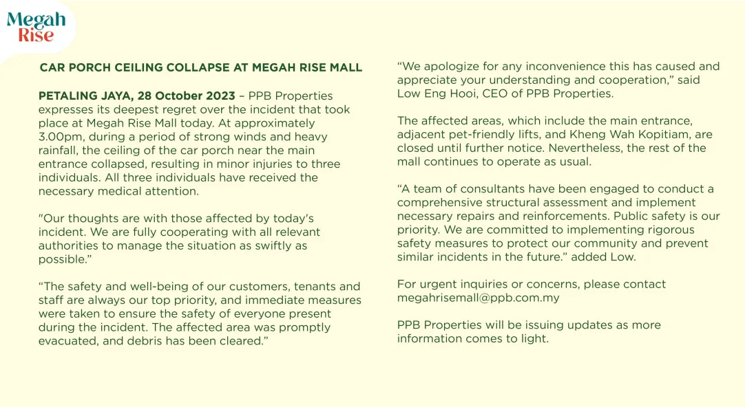 It was said that, unfortunately, 3 individuals suffered minor injuries from the incident and have received necessary medical attention. ” Our thoughts are with those affected by today’s incident. We are fully cooperating with all relevant authorities to manage the situation as swiftly as possible,” the management wrote. Megah Rise Mall also apologised for the incident and said that they would be conducting a comprehensive structural assessment to further ensure customers’ safety.
