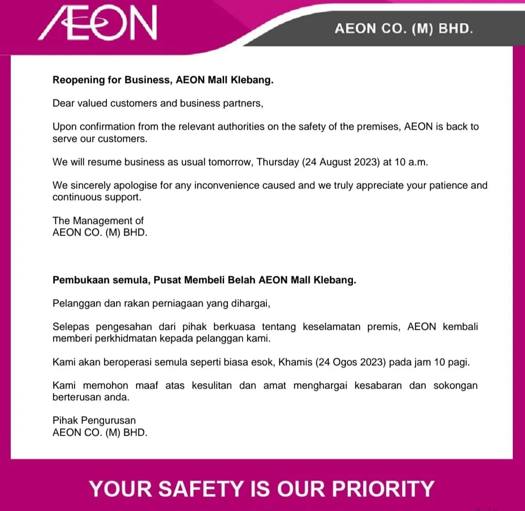 The mall was ordered to cease operations until local authorities confirmed the building’s safety. Around 11:25pm last night, AEON Mall Malaysian posted an official statement on Facebook to inform customers that the Ipoh branch had been given clearance to resume operation the following morning at 10am. “We sincerely apologise for any inconvenience caused and we truly appreciate your patience and continuous support,” the statement reads.
