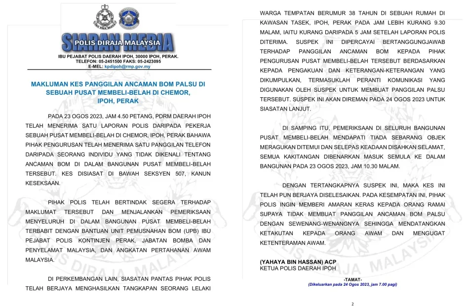 As for the anonymous person who made the threat, PDRM confirmed that the perpetrator had been arrested. In a statement posted on Facebook today (Thursday, 24th August), it was said there were no suspicious objects found inside the mall after a thorough investigation. The 38-year-old suspect was apprehended at his home around 9:30pm and admitted to making the false bomb threat.