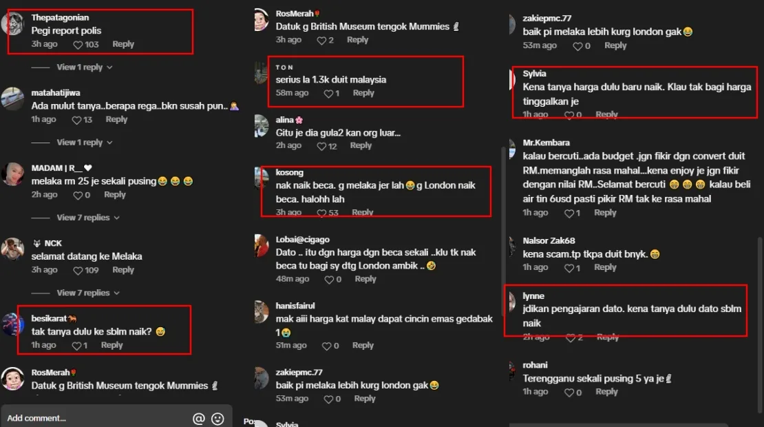 Netizens reacted to the TikTok post, with some wondering why Dato Seri Vida didn’t ask for the price before boarding the trishaw. Others suggested that she should have just gone to Melaka if she wanted to ride a trishaw, as they’re popular in Bandar Hilir. A few urged her to file a police report to ensure that no one else would fall victim to the scam.