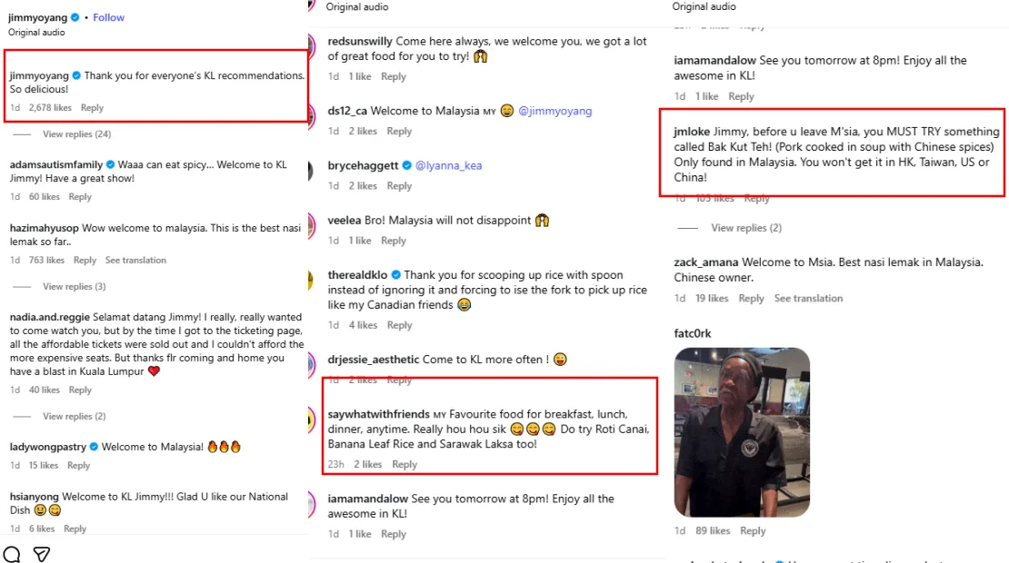 Many of his fans were delighted to hear that he enjoyed nasi lemak and even suggested other local dishes, such as bak kut teh, for him to try before continuing his tour. Others simply offered a warm welcome, excited to attend his show the following day. You’ll be pleased to know that Jimmy took those recommendations on board, posting on his Instagram Story yesterday that he had gone to try bak kut teh at an undisclosed location. He also shared a follow-up story, thanking the Malaysian audience for a fantastic show.