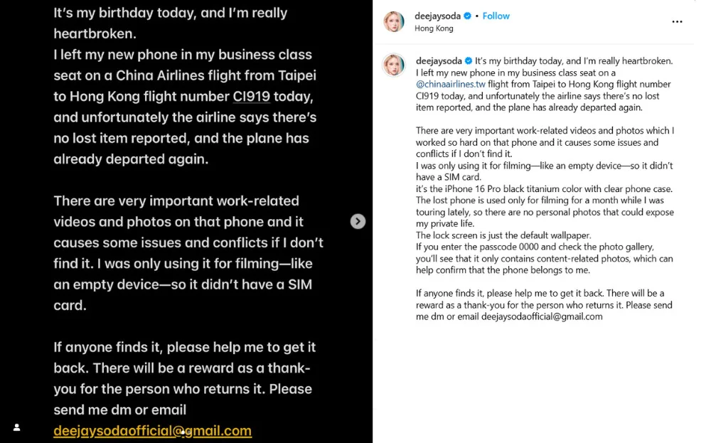 According to the DJ, whose real name is Hwang So-Hee ( 황소희), she boarded a China Airlines flight from Taipei to Hong Kong on the eve of her birthday (7th April 2025, Monday). Unfortunately, DJ SODA disembarked the flight with her newly purchased iPhone 16 Pro left behind on her business class seat. After realising her phone was still on the plane, she contacted the airline, but they said they didn’t find her phone on the flight.