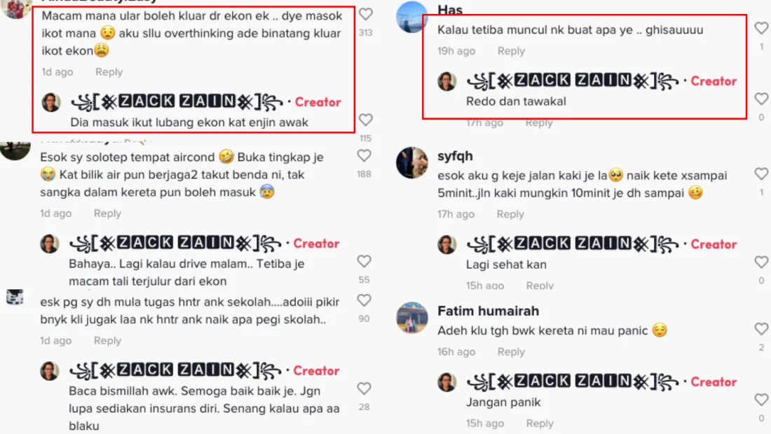 According to the TikToker, the snake must’ve gotten into the air-con vents through the car’s engines. The viral video, which has now reached over 500k views, drew a lot of attention from netizens, and many shared how they would’ve panicked if they were in Zack’s shoes. Some wanted to know what should be done in case this happens but the content creator jokingly answered that they should stay still and pray for the best.