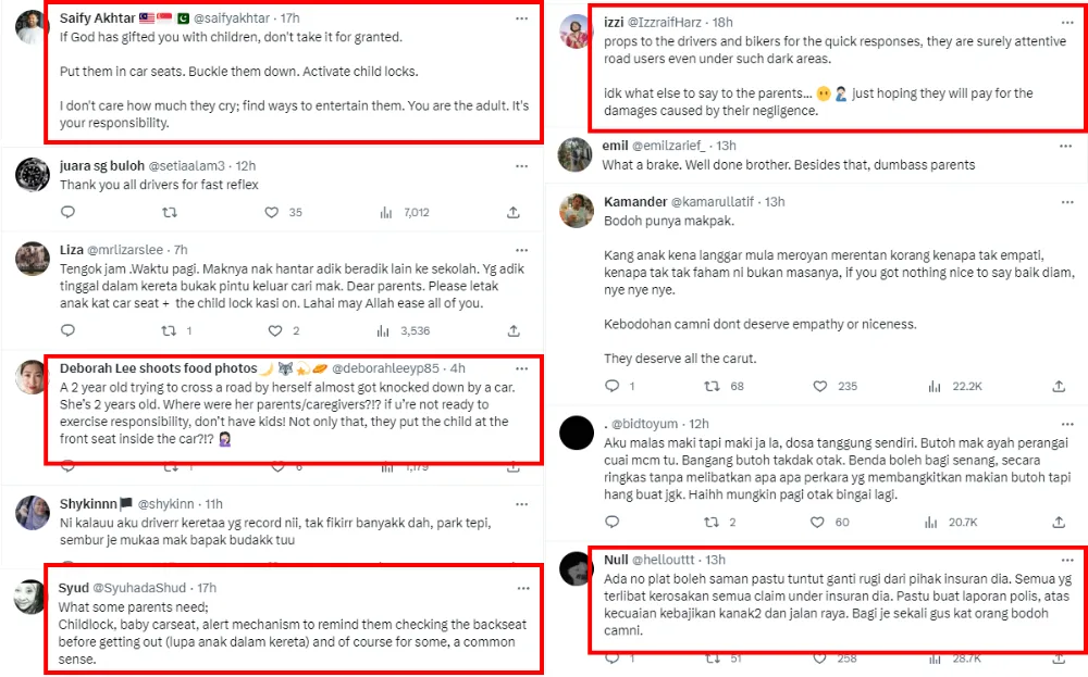 Many netizens have reacted to the dashcam footage, expressing shock towards the incident and disappointment towards the mother’s carelessness. Many slammed the mother for not utilising the child safety lock system in the car and not placing the toddler in a child’s car seat. Many also praised the driver’s quick response and the other motorists at the scene for reacting calmly following the incident. Some also advised the affected motorists to get compensation from the parents for the damages.