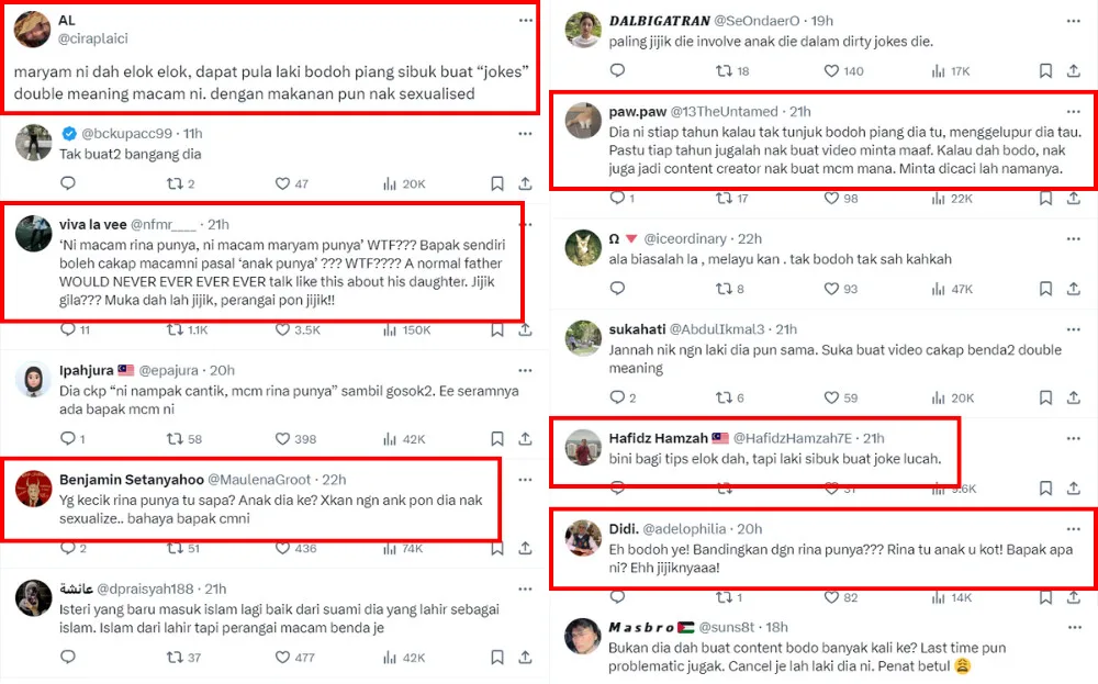 Netizens also reacted negatively to Ryzal’s comment, criticising him for his distasteful jokes. Many slammed him, calling him gross for sexualising fruits and making inappropriate comments about his wife. Many also showed anger over him making the same inappropriate comments about his young daughter. On the other hand, some defended Maryam, saying her video and tips were great until her husband’s unnecessary remarks.