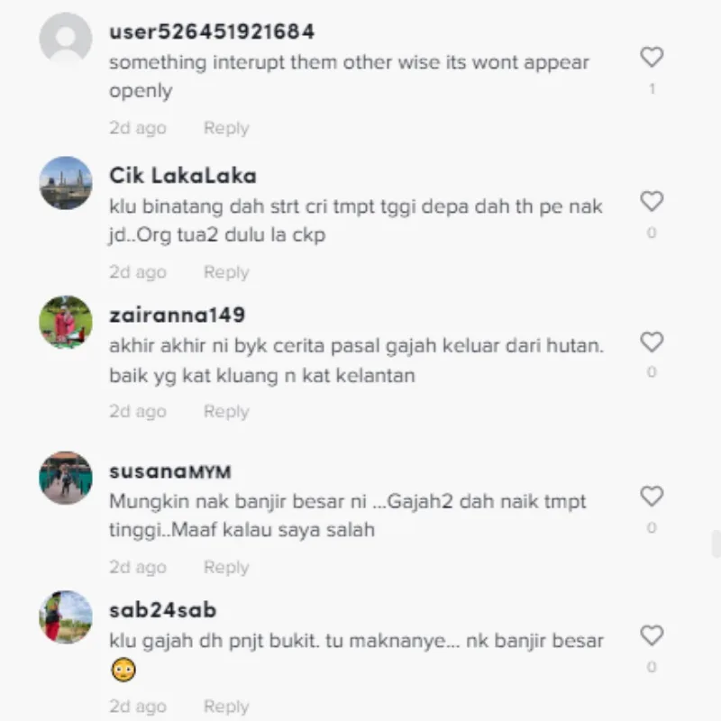 A few comments on the video by netizens seemed to agree with the orang Asli beliefs. These netizens commented that elephants climbing the hills is rather concerning as a natural disaster might strike the state or even the whole country.