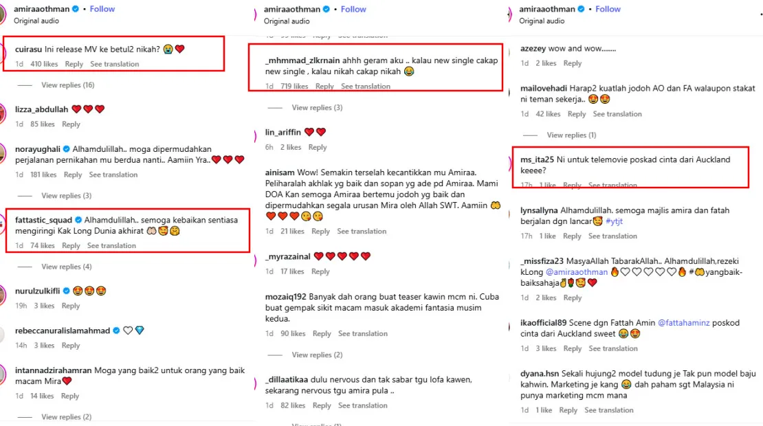 While some congratulated the actress on what they believed to be the next chapter in her life, others were left puzzled, questioning whether she was truly getting married. A number of fans also speculated that the video might instead be a music video or a promotional snippet for her upcoming telefilm “Poskad Cinta Dari Auckland”, in which she stars alongside Fattah Amin.