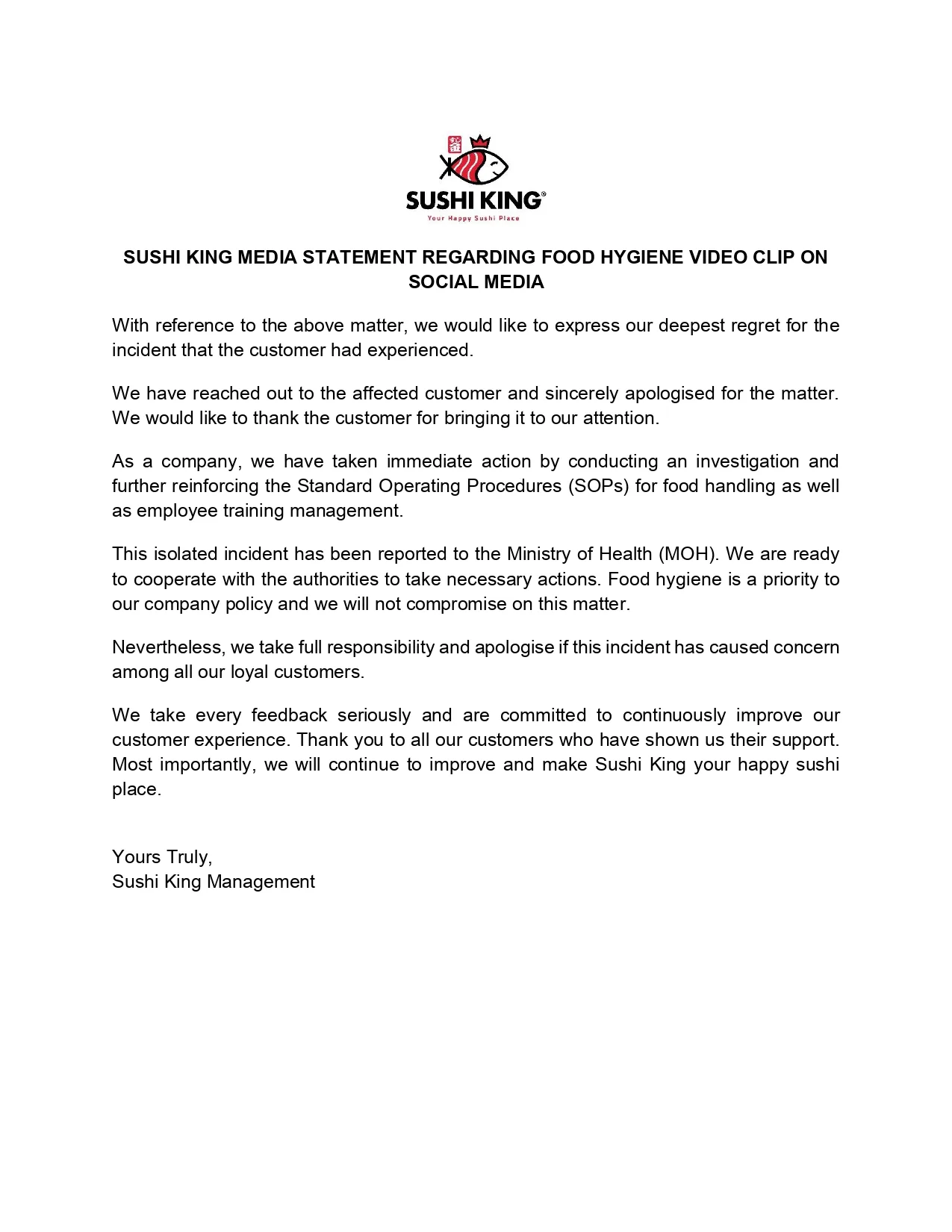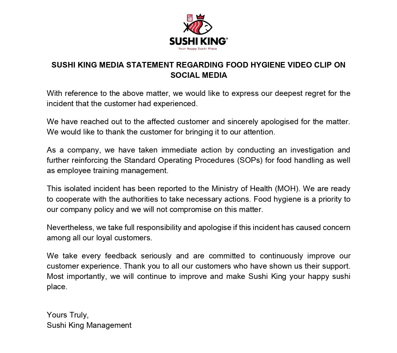 The food brand also informed that the incident has been reported to the Ministry of Health (MOH) and will cooperate with the authorities to take necessary actions. Read the full statement below: