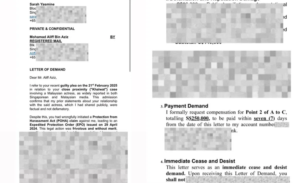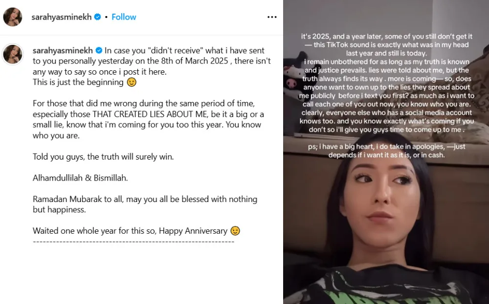 Recently, the Singaporean influencer shared a post depicting a letter of demand towards the actor. The letter demands Aliff to pay SGD250,000 (approximately RM830,000) in compensation for wrongfully initiating a Protection from Harassment Act (POHA) claim against her. Previously, Sarah alleged that Aliff and Ruhainies had committed khalwat, which the two stars vehemently denied. However, the pair’s recent guilty plea suggested that Sarah was telling the truth.