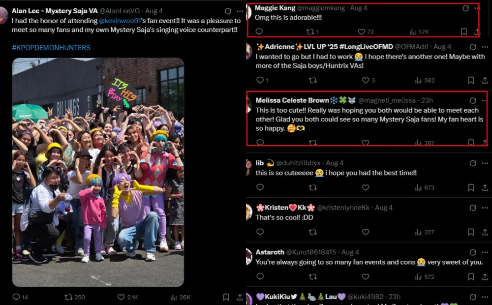 “I had the honour of attending Kevin Woo’s fan event!! It was a pleasure to meet so many fans and my own Mystery Saja’s singing voice counterpart!!” Alan wrote in his Twitter post. Fans online expressed their excitement over the duo’s appearance, with many sharing clips and photos from the event. Even the film’s director, Maggie Kang, joined in, commenting on how adorable the two were posing with fans together.