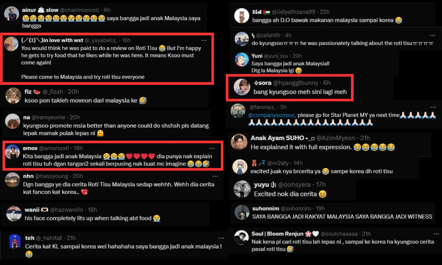 It seems the “Mars” singer couldn’t move on from his KL trip nor forget the taste of Malaysia’s food, as he mentioned eating roti tisu in Malaysia during the second day of his closing fan concert tour in Seoul last Saturday (12th October 2024). In a video posted on Twitter by @/squishylilbear, Kyungsoo can be seen sitting for his talking segment while photos of him savouring the crispy flatbread were shown in the background.