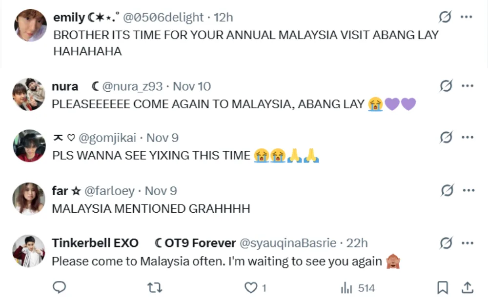 The 34-year-old then says he will visit Malaysia in the future, before bringing up his nickname, “Abang Lay”. While the mention of Malaysia was brief, and the idol never directly confirmed a show in the country, it was enough to pique the interest of local EXO-Ls. Many cheered over the possibility of another Lay concert in Malaysia. Meanwhile, some discussed whether Lay was talking about an EXO concert.