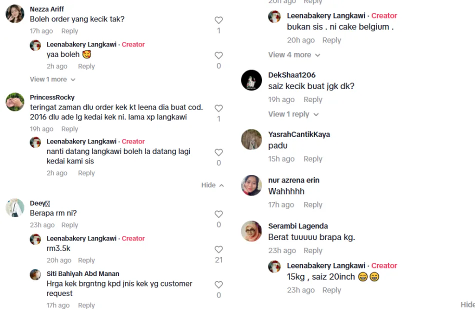 The TikTok post has since gone viral, with many expressing curiosity about the dessert. The bakery took the time to respond to some of the netizens’ questions, explaining that the cake is a Belgian cake, weighing approximately 15kg and measuring 21 inches in diameter. Despite its relatively simple design, the cake came with a hefty price tag. When asked about the cost, the bakery revealed that it was priced at around RM3,500!