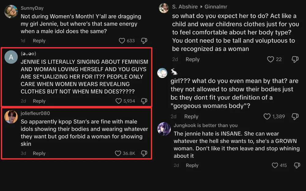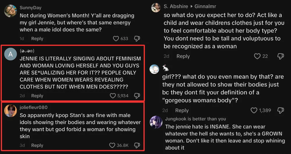 The immediate backlash has since sparked online debate on double standards in the industry, with fans defending Jennie and her choices towards her own body. A fan commented, “So apparently kpop stans are fine with male idols showing their bodies … But god forbid a woman for showing skin”. Despite the incident, Jennie remained professional and continued performing without hesitation, earning praise for her composure on stage.