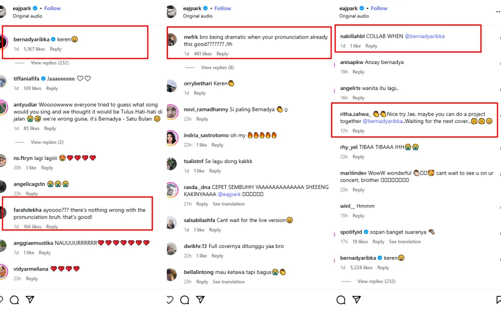 Fans praised eaJ’s rendition, commenting that his pronunciation was perfect. Others expressed their hope that the two artists might release a duet version of the song one day. Even Bernadya herself praised the singer, writing, “Keren 😀”, which means “Awesome” in Indonesian. Will eaJ release a full version of his cover? Or better yet, will he and Bernadya perform a duet? Let’s hope so.