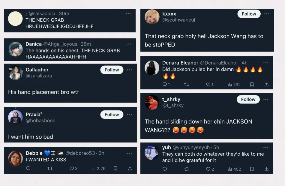 Following that video, a closeup clip of the two artists making eye contact while taking turns to cup one another’s face immediately began circulating the internet. BIBI’s fans went wild, with a good amount of them wished they were in Jackson’s shoes. However, some turned on their overprotective mode over the singer. Meanwhile, a majority of Jackson Wang’s fans went insane at his hand placement on BIBI’s face and neck. One netizen even commented, “Jackson Wang is stronger than me. I would’ve kissed her.”