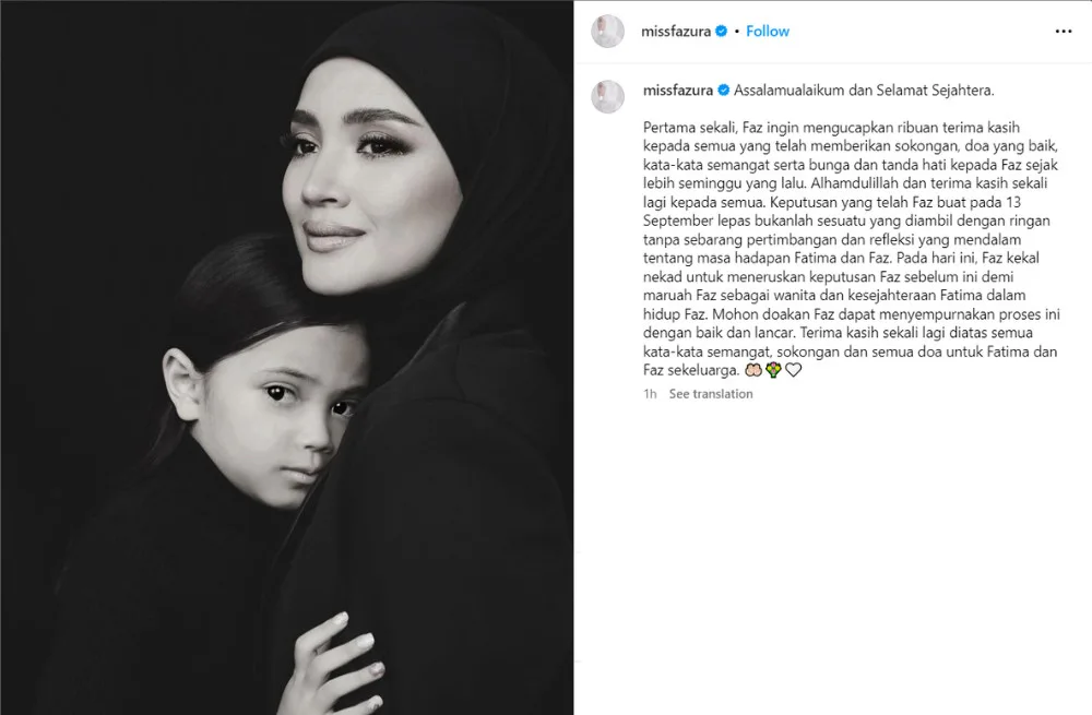 After the court hearing, Fazura took to Instagram to thank fans for their ongoing support. However, she said that she is standing by her decision to divorce her husband to preserve her dignity as a woman and the well-being of her daughter, Fatima. Meanwhile, Fattah posted a photo of Fazura and their daughter and asked for the public’s well-wishes, adding that whatever happens, he will still love his family.