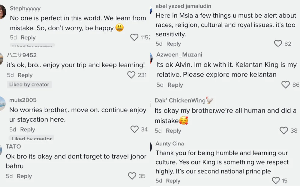 Scrolling through his TikTok comments, most netizens accepted his apology and thanked him for his effort in acknowledging Malaysia’s customs. Many of them also made jokes to lighten the heated incident. The TikToker ended his video by saying that he would pay more attention to these things in his upcoming videos.
