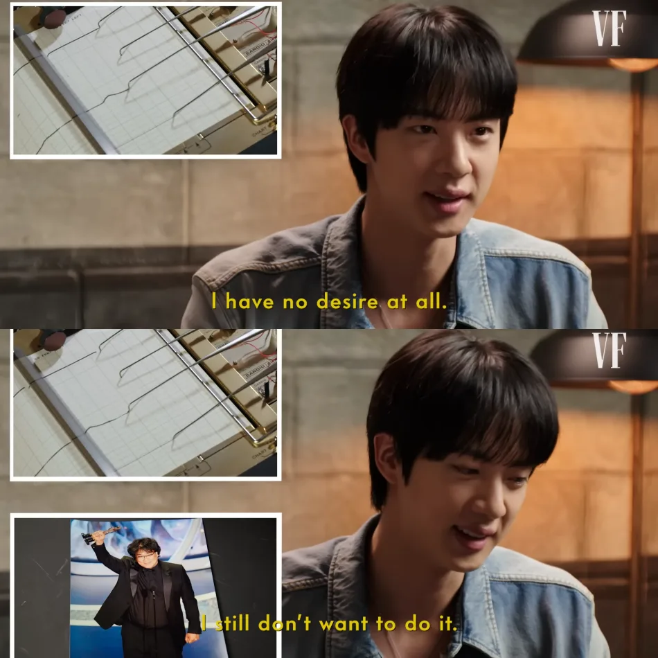 Despite holding a degree in acting, Jin has no desire to pursue a career in it. However, the polygraph detected deception, though the idol insisted he was telling the truth, even if offered a role in a Bong Joon Ho (봉준호) film. He went on to explain that the reason he doesn’t want to become an actor is that it requires a great deal of effort and feels like an intimidating challenge to take on. Still, fans remain hopeful that they’d get to see Jin show off his acting chops one day.