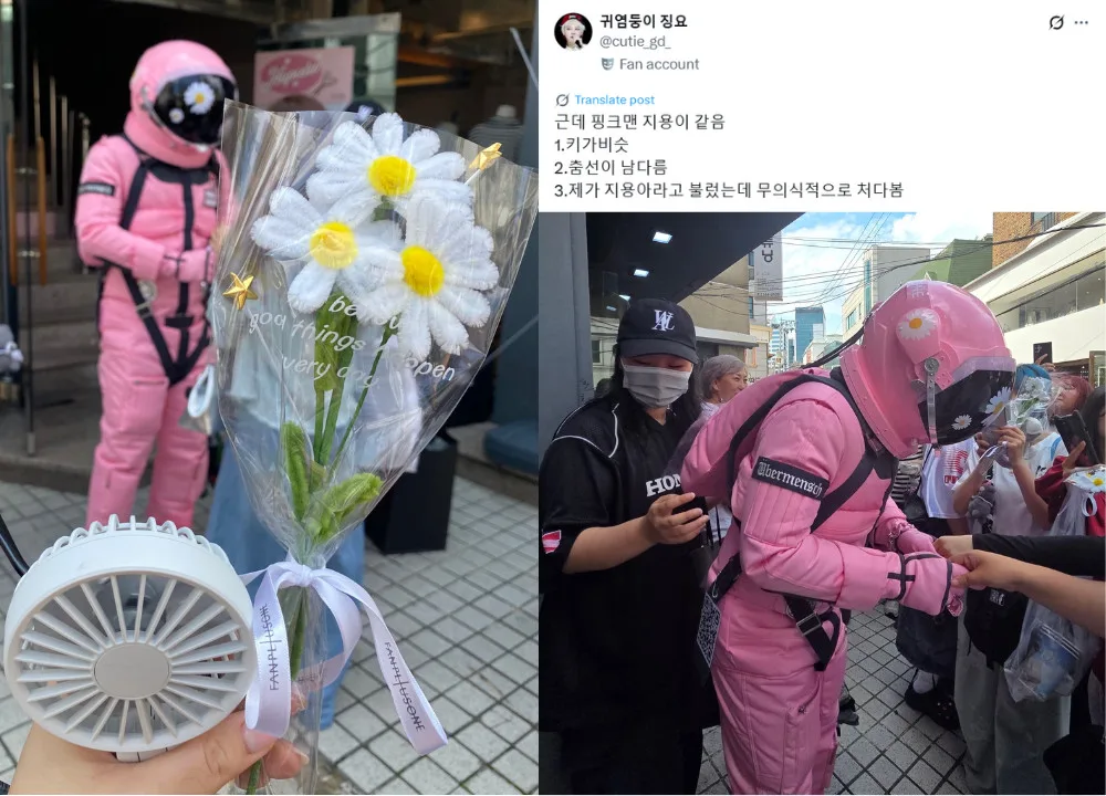 For the event, a mysterious man dressed in a pink spacesuit walked around the two areas, handing out daisies for those who knew the special “code name”. Daisies are flowers closely associated with G-Dragon and are even the motif for his lightstick. As such, fans in the area made time to find the pink spaceman to grab a daisy for themselves. However, upon meeting the spaceman, many were convinced that the man in the suit was G-Dragon.