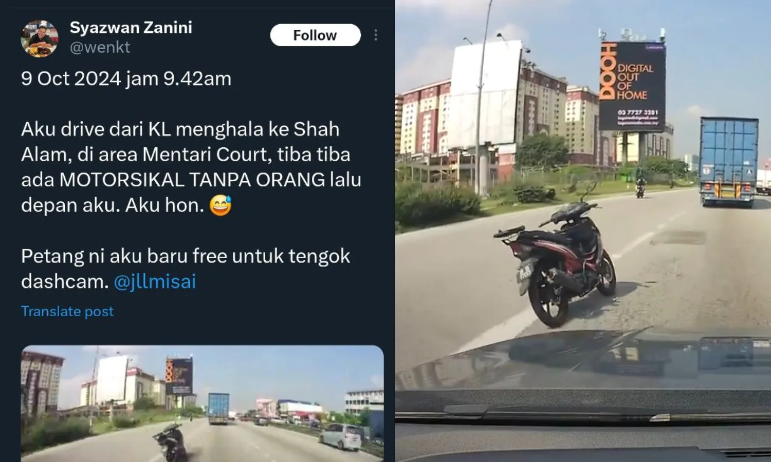 Twitter user @/wenkt, also known as Syazwan Zanini, shared his own surreal experience of witnessing a riderless motorcycle moving down the road. The extraordinary incident, which felt like something out of a dream, was captured on his car’s dashcam yesterday morning (Wednesday, 9th October) while driving from Shah Alam to Kuala Lumpur near the Mentari Court area. Here’s what happened:
