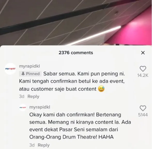 However, as it turns out, the lady’s performance was not for a late Halloween celebration. RapidKL stepped in to explain they had looked into matters and had thankfully received a clarification that had nothing to do with ghosts. “There was an event at Pasar Seni (held by) the Orang-Orang Drum Theatre,” they stated. “This definitely counts as (creating) content,” they added.