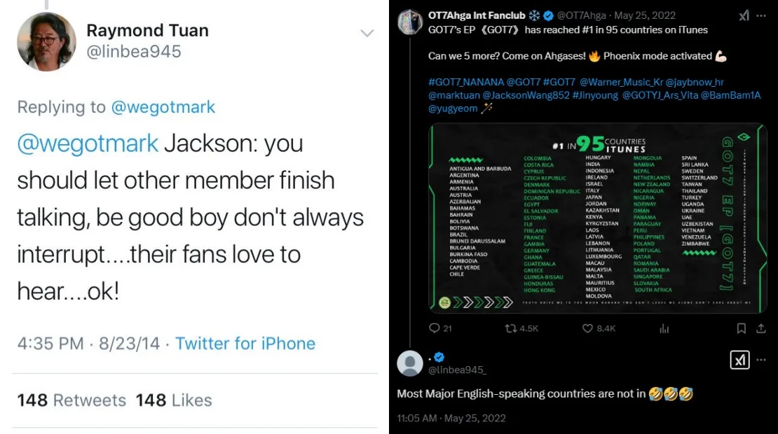 From screenshots shared by fans on Reddit, one of the most controversial comments he made dates back to 2014 when he appeared to scold Jackson for speaking over his members during a concert. Another one was in 2022 when Raymond discredited GOT7’s achievement of reaching No.1 in 95 countries on iTunes, claiming that none of the countries listed were English-speaking ones.