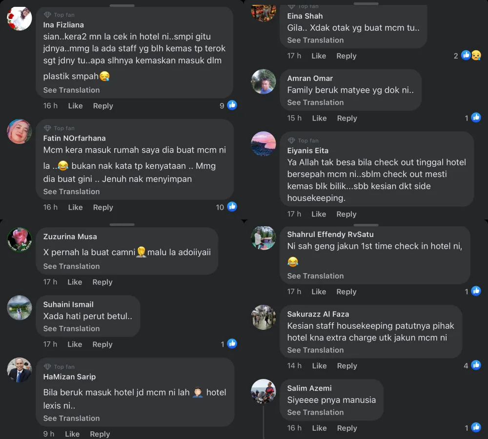 Scrolling through the comments, many people are enraged after seeing the condition of the room the guests had left it in. One netizen said, “Pity the housekeeping staff. The hotel should charge extra for this kind of people”. Another said, “It’s not normal when you check out to leave the hotel in a mess like this. Before checking out, (we) should tidy up a bit.”