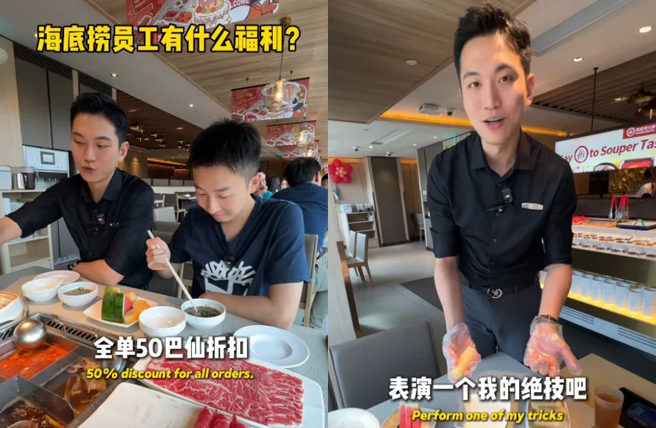 The influencer noticed his Haidilao name tag and asked if he could showcase a day in his work life. As they made their way to the restaurant, located at Dhoby Ghaut, the staff member, known as Ronghui, explained that he has been in the country for about 20 years and has worked at the Haidilao restaurant for 6 years. When asked about his exact position, he revealed that he is a trainee manager. His role is similar to that of the store manager, except he focuses more on taking care of his colleagues, while also serving customers.