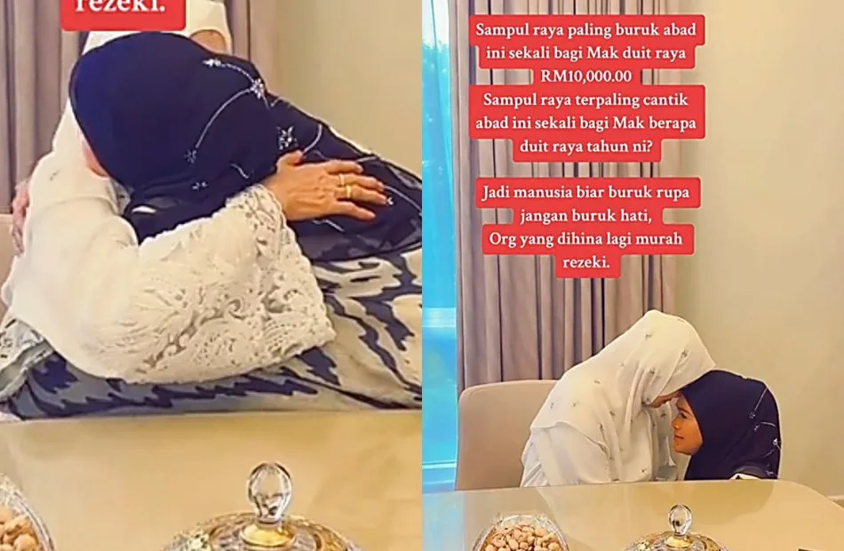 Famous local hijab entrepreneur, Haliza Maysuri, went viral this week when she gave her mother a packet of “duit raya” worth RM10,000. She also wrote a caption, “Every year, this old Raya envelope gives Mom RM10,000, even if people insult your child’s appearance. But your child has abundant blessings. Don’t take it to heart, Mom. What mother wouldn’t feel sad when the maid told you that the Bawal Exclusive Raya envelopes went viral this year, and the maid read out all sorts of unmentionable comments during this holy month?”
