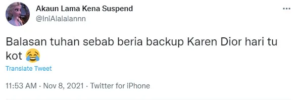 On the other hand, there were also a few nitpickers out there who left sarcastic comments in response to @therealzahrin’s post on Twitter. One commentator, @IniAlalalannn, appeared to mock the 55-year-old by saying, “Maybe this is a retribution from God for backing up the ‘‘Karen’ from Dior the other day 😂.”