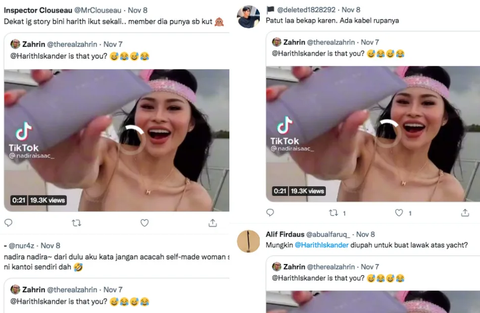 Now that the video has gone viral, a lot of people have been wondering what was Harith doing with Nadira on the yacht? Some netizens said that the “Talentime” actor was on a vacation with his wife Dr. Jezamine Lim, and might have accidentally been included in Nadira’s TikTok post. A quick peek on Harith’s IG also showed that he uploaded a photo of him with his wife on the same cruise.