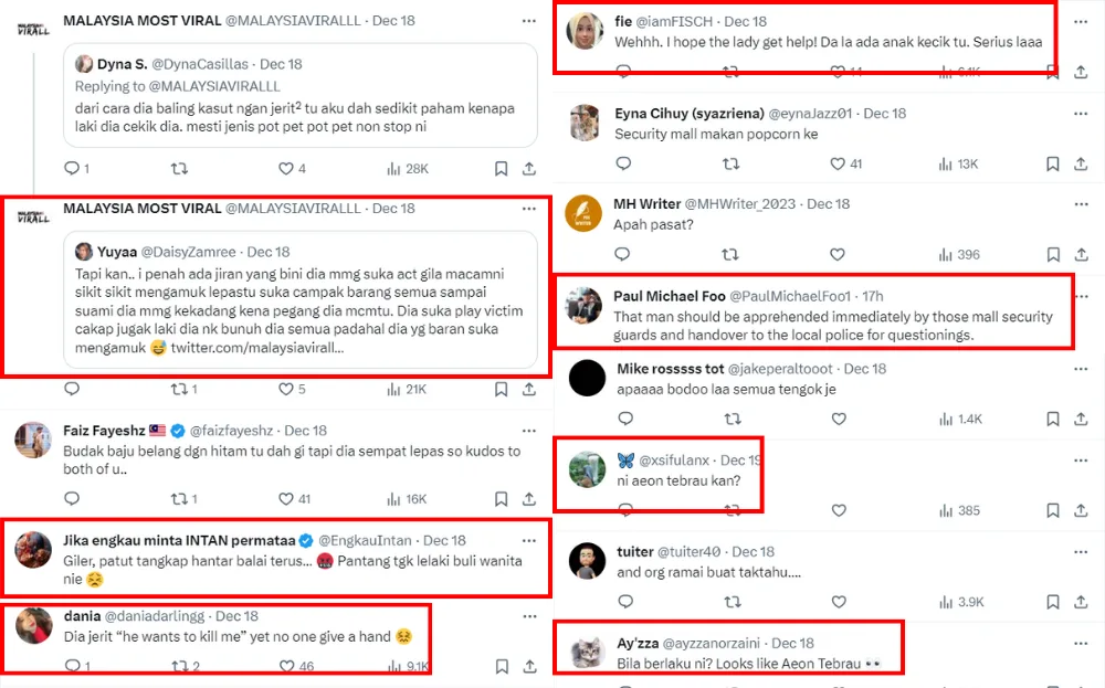 While not confirmed, many netizens have concluded that the fight took place at AEON Mall Tebrau City in Johor, based on the background. There is no other context for the video nor the relationship between the man and the woman. However, many have urged authorities to investigate the incident, claiming that it could be a case of domestic abuse. However, some have noted that the woman may suffer from a mental illness and that the man could have acted in such a manner to withhold her from acting erratically.
